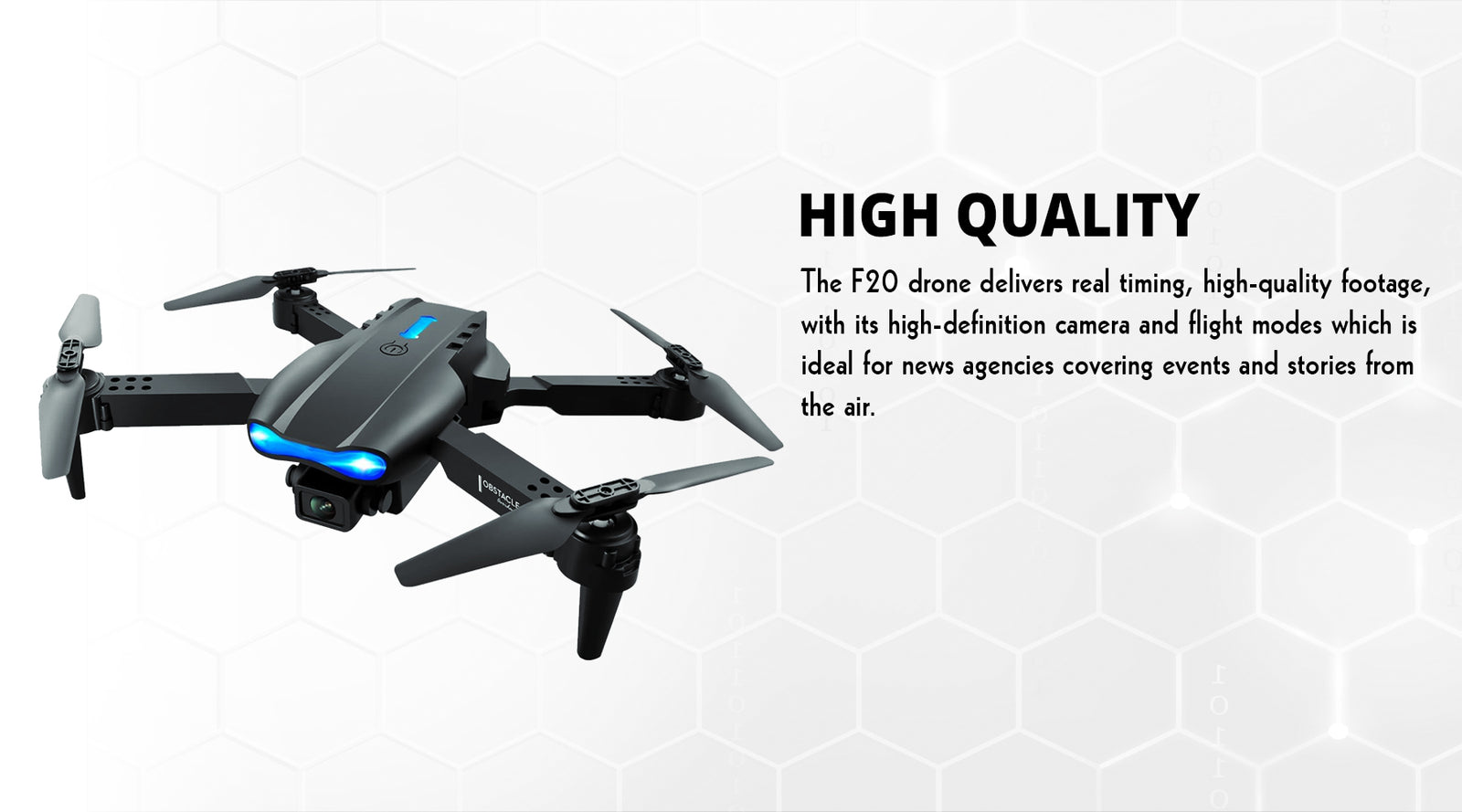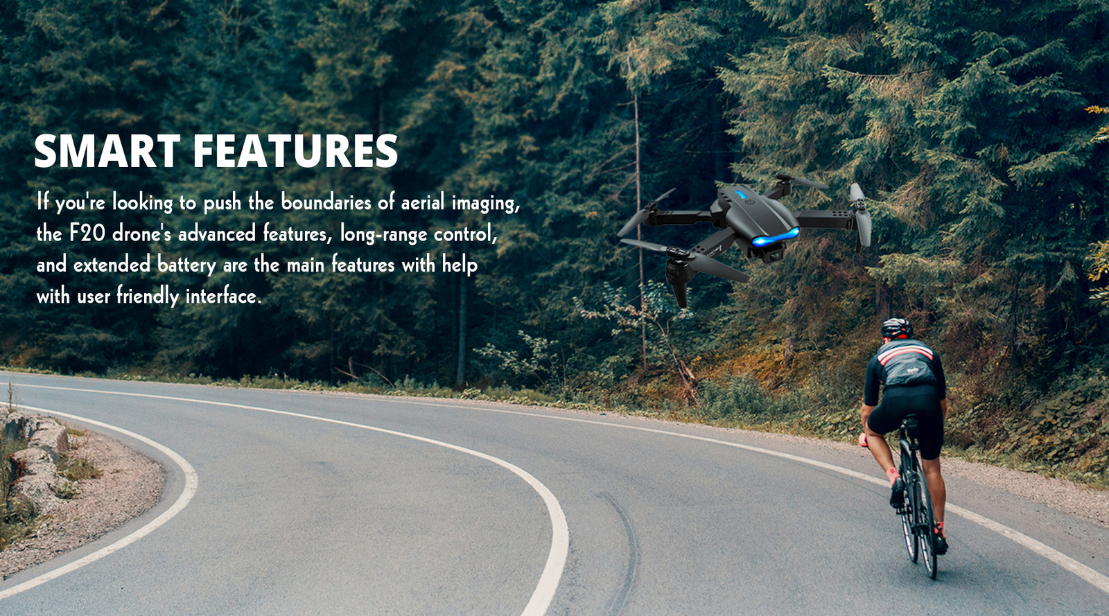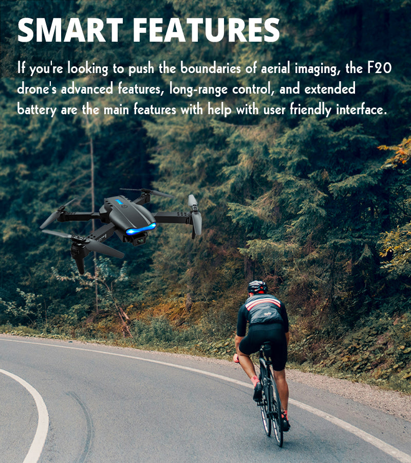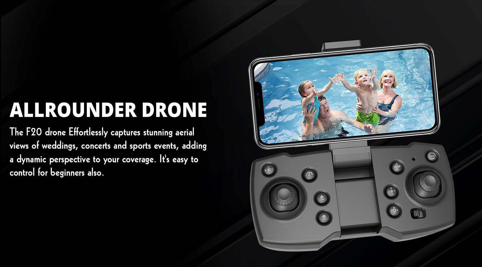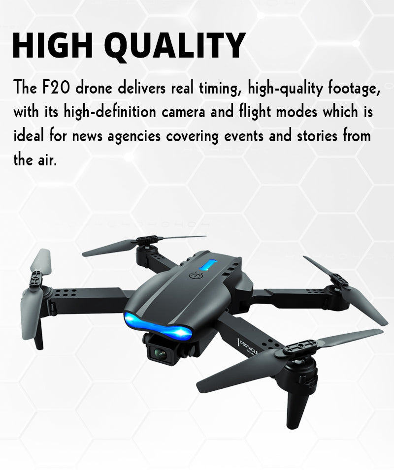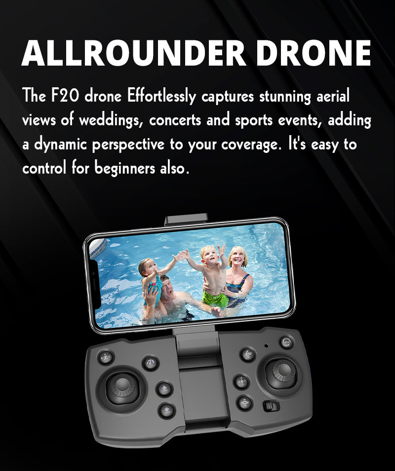 Introducing the professional F20 Drone by OneaimFit. It is an extraordinary aerial tool designed for professional-grade photography and videography. Equipped with a high-resolution camera, it captures stunning images and videos with high 4k resolution. The drone's compact and foldable design makes it easy to travel and seamlessly offers intuitive controls and live streaming. It has advanced GPS and WiFi options with powerful batteries offering extended flight time. Whether it is used for professional filmmaking or aerial inspection, it delivers exceptional performance for capturing captivating content.